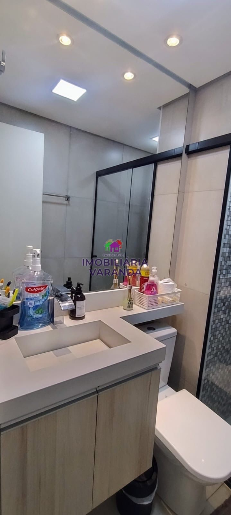 - 1 banheiro (planejado, espelho, box de vidro, nicho duplo).